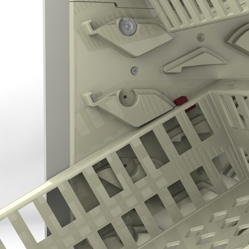 Les conteneurs peuvent s’incliner une fois sortis de l’armoire, ce qui facilite l’accès à l’opérateur, surtout lorsqu’ils sont placés en haut. Les conteneurs il reviennent à une position horizontale une fois qu’ils sont réinsérés dans l’armoire.